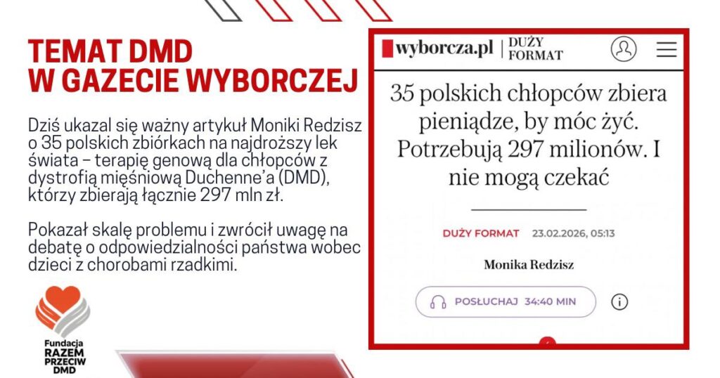 W dzisiejszym „Dużym Formacie” „Gazety Wyborczej” ukazał się ważny artykuł Moniki Redzisz o 35 polskich zbiórkach na najdroższy lek świata – terapię genową dla chłopców z dystrofią mięśniową Duchenne’a (DMD), którzy zbierają łącznie 297 mln zł. Dzięki tej publikacji temat DMD i gigantycznych zbiórek trafił do opinii publicznej jako problem systemowy, a nie pojedyncze, „oderwane” historie.
